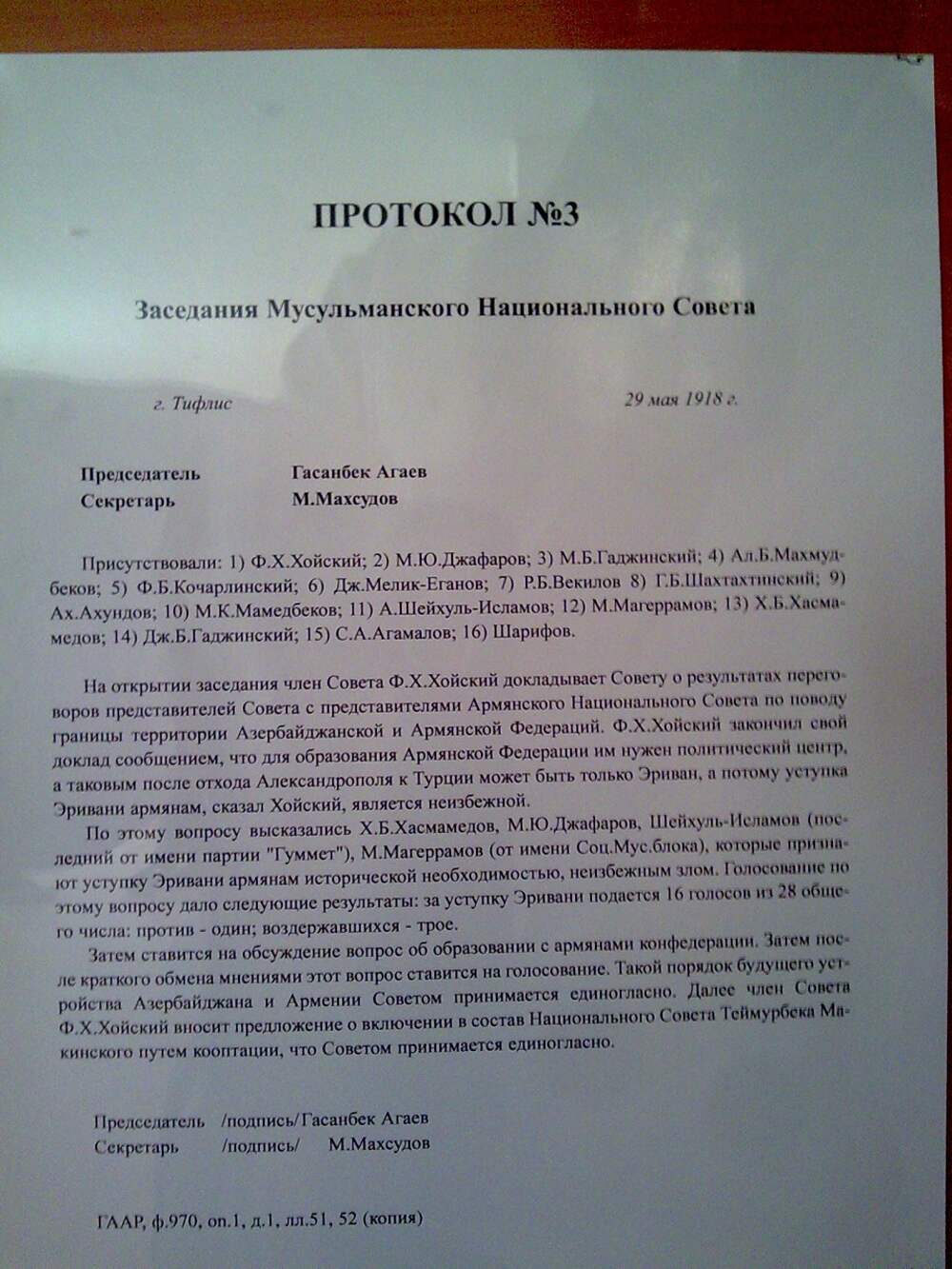 Документ 29 мая 1918 г. о передаче Эривани армянам со стороны АДР - ФОТО